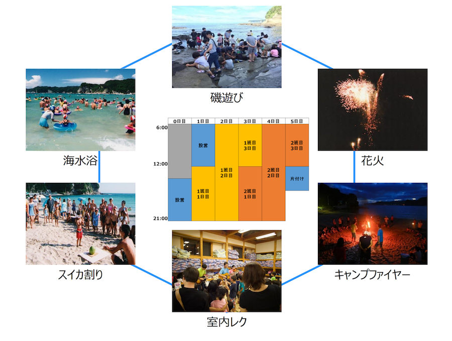 2泊3日の宿泊行事は海水浴をはじめ、室内レクリエ―ションや、キャンプファイヤー、磯遊び、スイカ割りなど、
